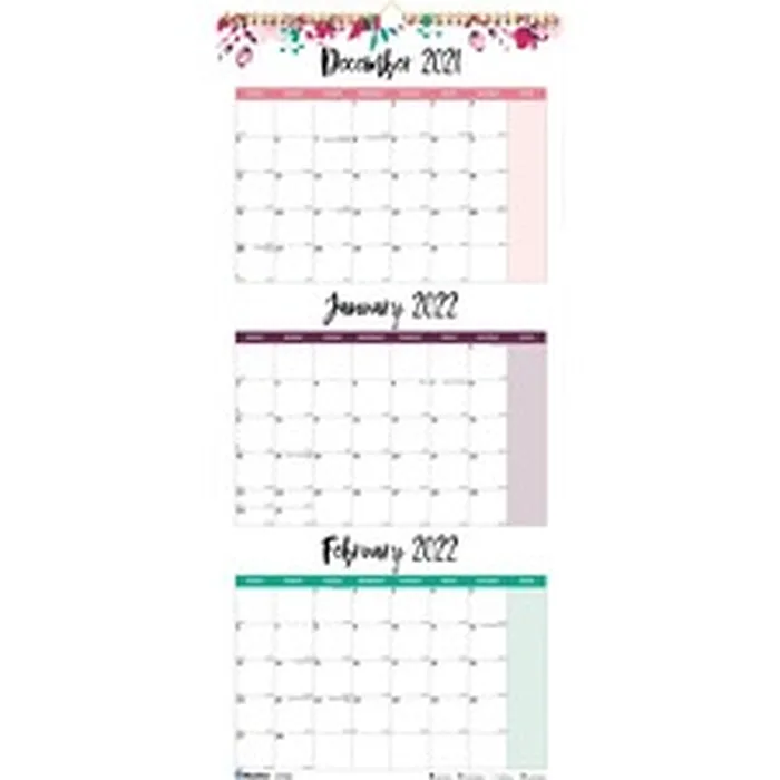 Track projects, create schedules, make daily notes or schedule vacations with this three-month wall calendar. It offers a quick view for advance planning up to three months and plenty of space to jot down important notes and reminders. Each page includes three full months along with other useful features. This three-month-per-page format includes daily unruled blocks, Sunday-through-Saturday scheduling, count of days/days remaining, moon phases and holidays. Dated planning pages range 12 months from December to January. Calendar also features reinforced backer and twin-wire binding with a hook for easy hanging. Calendar pages are printed in English.