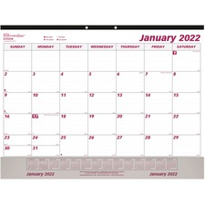 Monthly desk pad is made with a high percentage of recycled post-consumer material and features an ecological tip on each page. One-page-per-month format includes unruled daily blocks, Sunday-through-Saturday scheduling, moon phases, count of days/days remaining, holidays, an unruled notes column and a 14-month calendar reference on the bottom. Dated planning pages range 12 months from January to December and are bound at the top with a headband. The current reference month is bolded. Desk pad also offers a headband, two corners to secure pages and a reinforced chipboard back to protect your desktop.