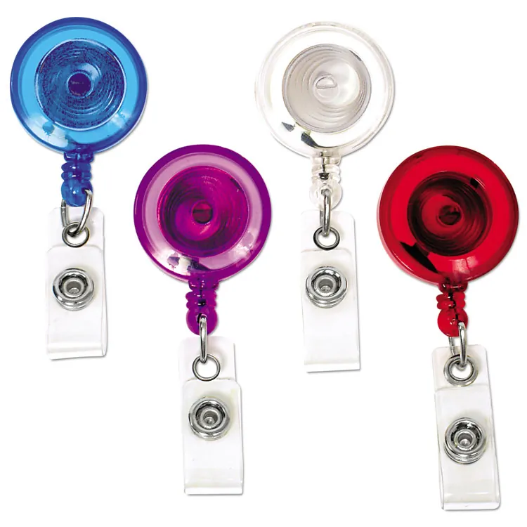 Enhance your identification needs with our durable plastic round reels. This 100-pack includes an array of colors such as black, royal blue, green, orange, yellow, and purple, all equipped with a clear vinyl strap and slide-type belt clip for easy attachment.