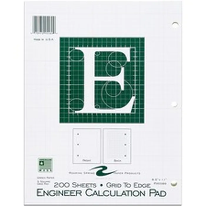 Engineers pad features grid-to-edge, 5 x 5 quad-ruling on the back of each sheet. The front has a simple outline. Each sheet is three-hole punched to fit inside standard-size, three-ring binders.