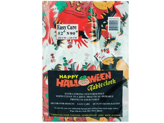 Featuring a charming vintage design, it showcases delightful graphics such as a flying witch, smiling pumpkin, playful bats, and more. Perfect for Halloween parties, family gatherings, or themed events, the tablecloth measures 52" x 90" and comes neatly packaged in a hanging poly bag.