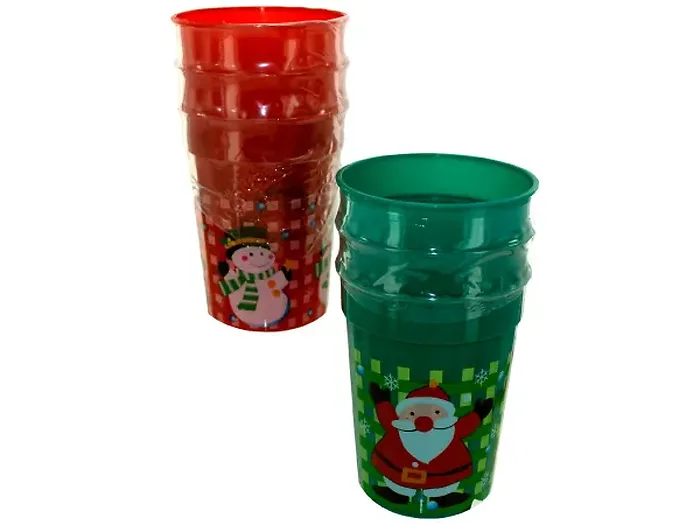 Celebrate the holiday season with our vibrant Festive Holiday Plastic Cups! Each pack includes three durable plastic cups, available in cheerful red and green colors, and adorned with delightful designs of a snowman or Santa Claus. Perfect for holiday gatherings, these cups measure 5 1/2" tall and 3" wide at the mouth, offering a fun way to serve drinks during festive occasions.