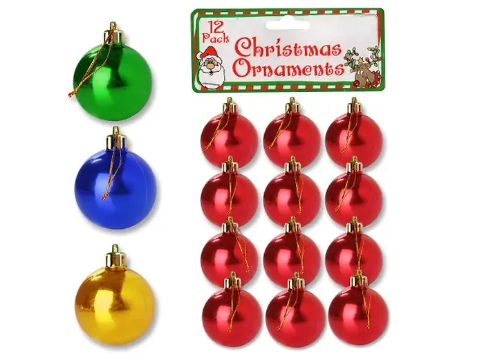 These assorted small holiday ornament balls are perfect for enhancing your festive decorations. Ideal for adorning Christmas trees, wreaths, or centerpieces, these versatile ornaments can also be used to add a charming touch to gift wrapping. Each pack includes 12 durable plastic ornaments in a vibrant mix of colors: green, blue, red, and gold. These ornaments measure approximately 1 1/2" in diameter and are packaged in a convenient poly bag with a header card.