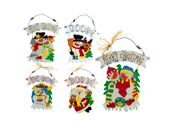 Introduce the spirit of the season into your home with this Charming Holiday Scene Wood Wall Plaque. This delightful decoration features assorted designs, including cheerful snowmen, serene angels, and festive Santa Claus. Each plaque is expertly crafted from wood and showcases a protruding front adorned with faux garland, adding a touch of whimsy.