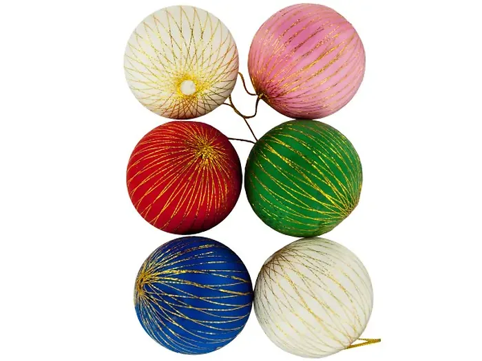 The set includes 6 beautifully designed ornaments in shades of red, green, pink, blue, and white, each adorned with elegant gold trim. Made from lightweight styrofoam and wrapped with durable nylon thread, these ornaments are both charming and long-lasting. Measuring approximately 1 3/4" in diameter, they are the perfect size for your holiday decorating needs.