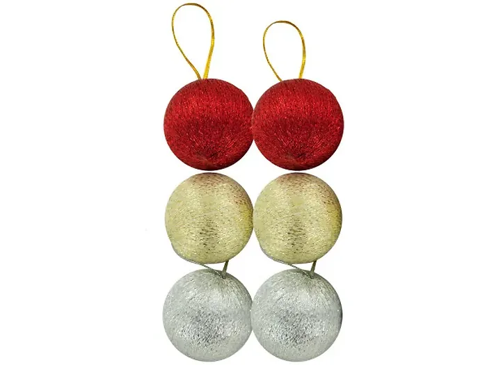 This exquisite set of 6 Christmas ball ornaments offers an elegant touch to your holiday decor. Perfect for adorning your Christmas tree, enhancing wreaths, or adding a decorative flair to gift wraps. Each ornament is crafted from lightweight styrofoam and intricately wrapped in shimmering silver, vivid red, or rich gold thread. They are beautifully packaged in a hanging poly bag for convenient display and storage.