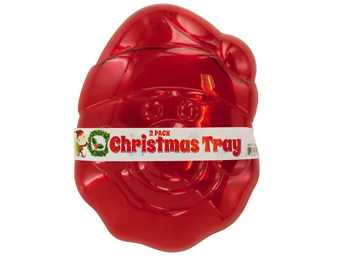 Perfect for candies, snacks, trinkets and more, this 2-piece Mini Santa Claus Tray Set features transparent red plastic Santa Claus-shaped trays with raised details. Each tray measures approximately 6.5" x 0.75" x 5.75". Comes packaged with a wrap around.