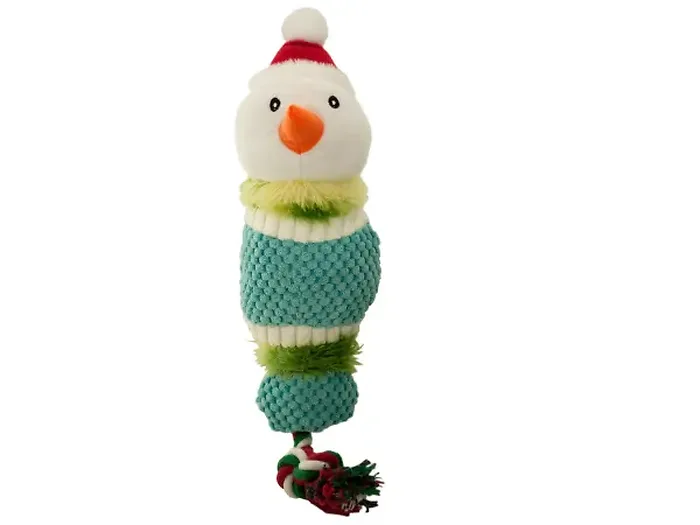 Bring festive cheer to your pup with the Holiday Character Knotted Rope Toy. This fun toy features a soft plush design available in three delightful characters: Santa, a snowman, or a teddy bear, all adorned with a festive Santa hat. The toy includes a plush body made from vibrant patchwork fabric and a sturdy knotted cotton rope for chewing enjoyment. Measuring approximately 18" long and 4.5" wide, it’s perfect for interactive play or solo chewing sessions.