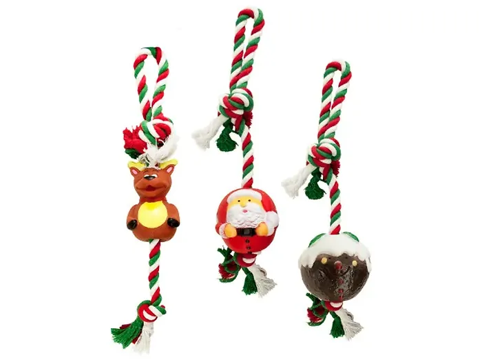 Get your furry friend into the holiday spirit with the Festive Squeaky Dog Toy! This charming toy combines a squeezable, squeaky Christmas character with a colorful knotted cotton rope, designed for both fetching and chewing. Perfect for interactive playtime, it features a loop for easy tossing and comes in a variety of delightful styles.