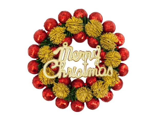 Add a touch of sparkle to your holiday decor with this stunning 6" Glitter Ball Wreath Hanging Decoration. This beautifully designed wreath features a delightful array of glitter balls, shimmering leaves, vibrant berries, and elegant metallic stars, all beautifully topped with a festive bow.