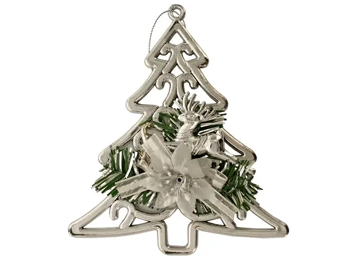 Enhance your holiday decor with this charming 6" Christmas Tree & Reindeer Hanging Decoration. The beautiful silver filigree design is adorned with a delightful reindeer, vibrant green pine needle tinsel, and an elegant silver bow.