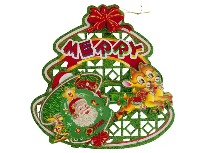 Enhance your holiday spirit with this delightful 14" Festive Glitter Santa & Reindeer Hanging Decoration. The imaginative tree-shaped design showcases Santa, his sleigh, and two adorable reindeer, complete with a cheerful "Merry" banner and a plush velvety bow at the top.