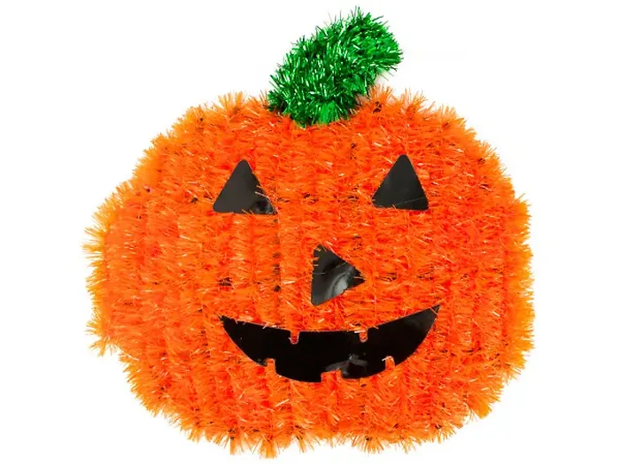 Get ready for Halloween with our Festive Halloween Pumpkin Wall Décor! This charming decoration features a vibrant orange tinsel-wrapped pumpkin complete with a green stem and a whimsical black cardstock face. Perfect for enhancing your front porch, door, or any indoor space.