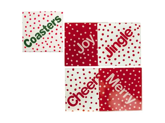 Enhance your holiday gatherings with this charming 4-piece Glass Coaster Set. Each coaster showcases a vibrant red and white polka dot design, adorned with cheerful phrases such as "Cheers", "Merry", "Jingle", and "Joy". Measuring approximately 3.625" x 3.625", these coasters not only protect your surfaces but also add a festive touch to your decor. The set comes beautifully packaged in an individual box, making it a perfect gift or addition to your holiday festivities.