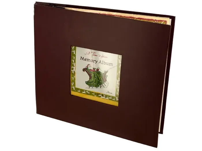 Capture your cherished holiday memories in the Santa's Memories: Holiday Photo Album. This beautifully crafted photo album features a durable maroon cardboard cover adorned with an enchanting art print of Santa, bringing festive cheer to your photo collection.