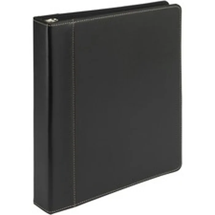 Contrast Stitch Leather Ring Binder uses beautifully crafted, bonded leather that brings about the look and feel of rich, black genuine leather. This leather portfolio binder is highly durable, stylish and versatile. Black leather-grain exterior is complemented with cream sewn accents for an extra touch of class. Binder also includes a saddle-stitched spine and concealed-rivet ring construction. These 1" capacity, round rings hold up to 200 sheets. Two interior pockets store and organize your important documents. Premium organizer binder is a popular choice among corporate executives, investment advisers, real estate professionals and anyone who is working with a high-value clientele.