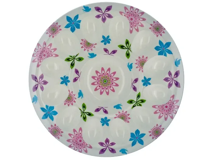 Enhance your gatherings with this charming retro floral egg tray. Designed to hold up to twelve eggs, it features a stylish round platter with a designated center compartment perfect for dips or garnishes. Crafted from durable white plastic, this tray showcases a delightful floral print that adds a cheerful touch to any occasion.