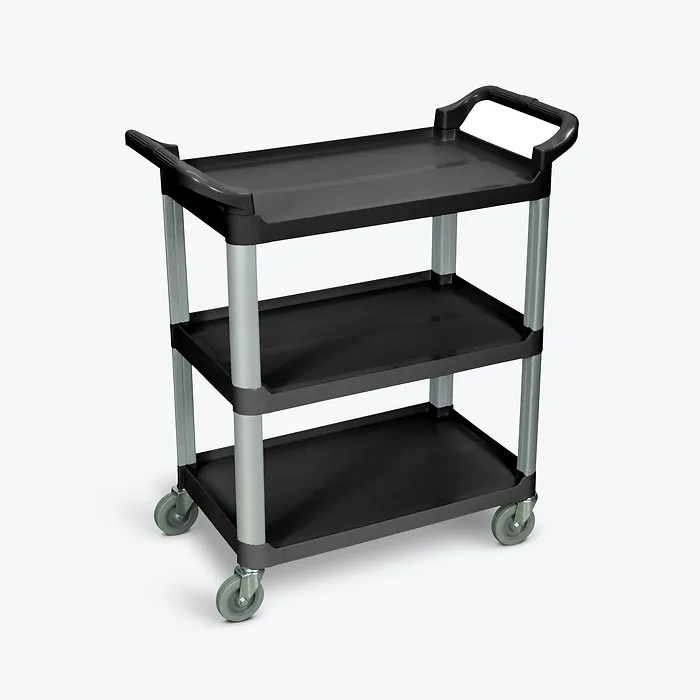 Lightweight yet sturdy, the Luxor Three-Shelf Serving Cart is the perfect blend of storage and maneuverability for food service, healthcare or light-duty applications. Polypropylene shelves are scratch-resistant and easy to clean, and aluminum uprights provide stacking strength that allows a 200-lb. capacity. All shelves have a 1" lip on the sides and back to help control contents while still allowing items to load or unload from the front. The 12" clearing between shelves offers ample space; two ergonomic push handles, combined with four 4" rolling casters, make this utility cart easy to maneuver.