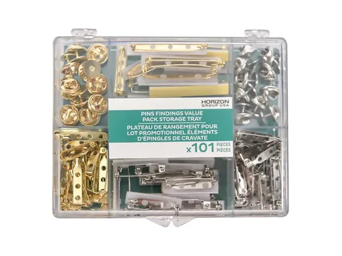 Perfect for beginners who are interested in making pins. This pins finding value pack has everything you may need. It contains 101 pieces of gold and silver pins findings and comes packaged in an acrylic case and shrink wrapped. The case measure 4.75" x 4.65" x 1".