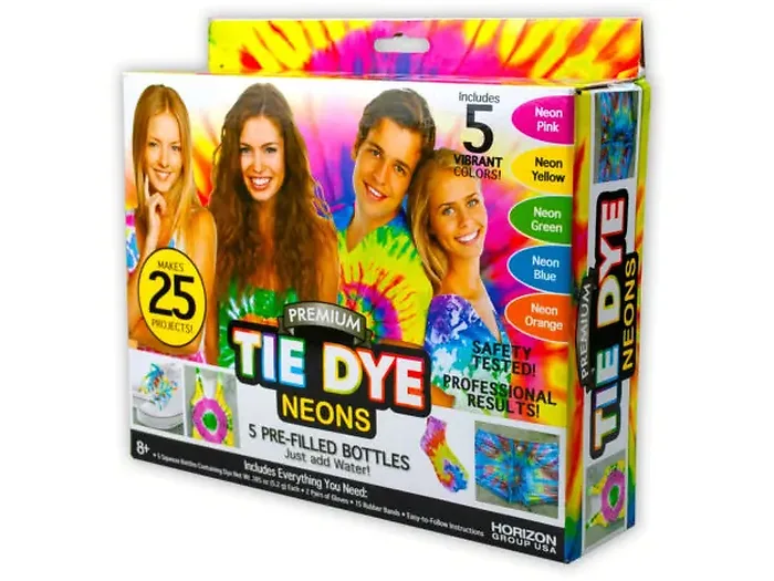 Create eye-catching designs with our Vibrant Neon Tie-Dye Kit. This kit includes five pre-filled bottles of vivid colors: Neon Pink, Neon Yellow, Neon Green, Neon Blue, and Neon Orange. Each kit comes equipped with two pairs of gloves, 15 rubber bands, and easy-to-follow instructions to help you achieve professional results. Packaged in a convenient 9" x 8" hanging box, it's perfect for parties, gatherings, or a fun DIY project!