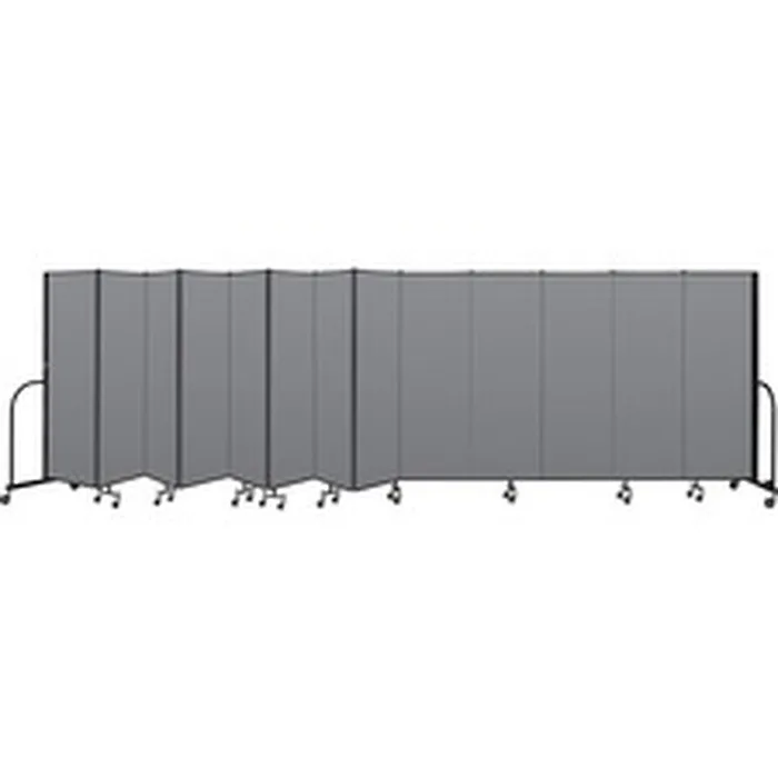 Freestanding portable partition optimizes limited space. Create training rooms, intimate settings for guest speakers, or hide unsightly construction. Multiple units lock together to form unlimited lengths. Partition features control hinges, sound-absorbing panels but no complicated track systems, costly structural supports or interference with a building's heat, light or ventilation systems. Room divider features self-leveling, locking casters. Caster wheels provide easy mobility to move and combine the partition with other partition for the configuration you need. Partition is made with fabric, black powder-painted metal trim and hinges. Partition contains a high percentage of recycled material.
