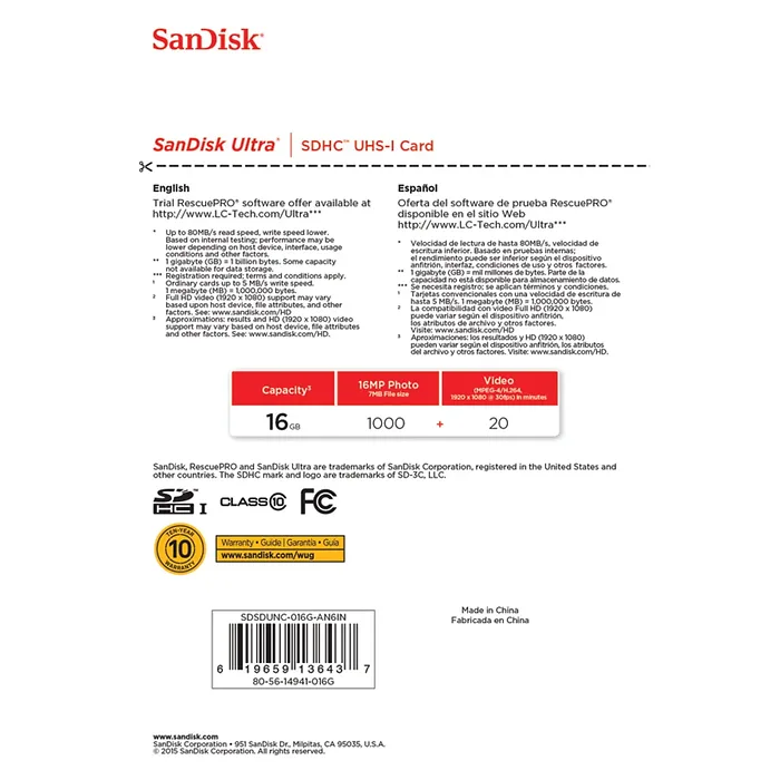 Record Full HD 1080p video with this Class 10 compliant 16GB Ultra UHS-I SDHC Memory Card from SanDisk. With enhanced data read speeds of up to 80 MB/s this Ultra SDHC memory card is designed to suit the needs of compact and mid-range point and shoot cameras. You can also save and store a variety of files such as music, movies, documents and more. The writable label found on the card allows you to write down what is saved to the card while the built-in write protect switch helps to prevent accidental data loss. This card, as with most SanDisk cards, comes shock, temperature, x-ray, magnet, and waterproof to take your files with you nearly anywhere you go.