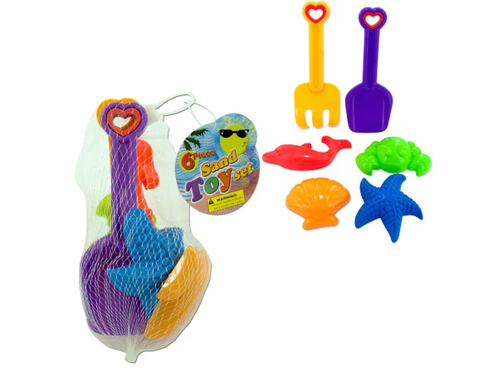 Make a day at the beach or park even better with this 6-piece Sand Toy Set featuring sand tools as well as 4 sea animal-shaped molds. The shovel, rake and sifter measure approximately 7" long and molds range in size from 3 1/4" to 5". Comes in assorted styles. Comes packaged in a net bag with a hang tag.