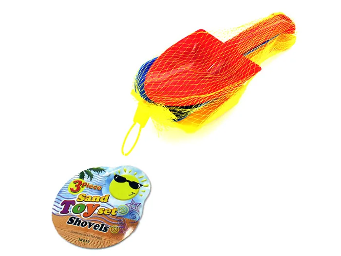 Perfect for beach days, this 3-piece Sand Toy Shovel Set will delight any child while they build and create their sand designs. Each shovel measures approximately 9" in length. Comes in assorted colors. Comes packaged in a net bag with a hang tag.