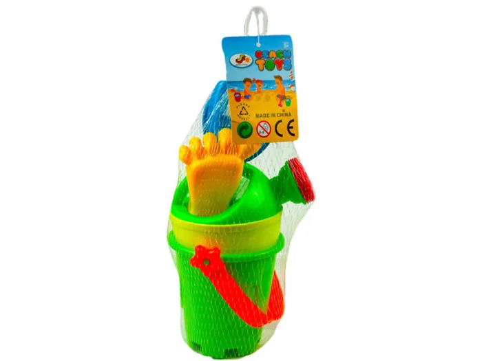 Summer is right around the corner, get your swimsuit on and head out to the beach with this 5 Pack Beach Play Set. Great for children of four years of age and above. The Beach Play Set comes with a sand bucket of 3.50" length x 3.25" diameter, water bucket 3.25" length x 3.15" diameter, shovel 5.50" length x 2" width, and a foot mold of 4" length x 2.25" width x 1" height. It comes in assorted colors and packaged in fishnet mesh and hanging tag.