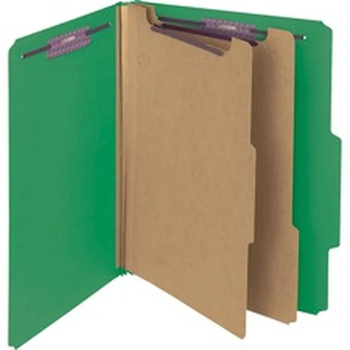 Protect your letter-size documents and fingers with Smead's patent-pending, SafeShield Coated Fastener Technology - the solution to fastener issues, including paper tears, finger cuts and excessive fastener crinkling. The cover features two 2" SafeShield bonded-style coated fasteners in positions 1 and 3. 2/5-cut tab is right of center. Sturdy, tear-resistant gusset expands 2". The cover is made of 20 point, Press Guard, heavyweight Pressboard stock with a special coating to resist moisture and stains. This extra-durable classification folder also features two dividers with 1/3-cut tabs to create six separate filing surfaces within one folder. Each 17 point kraft divider has one 1" SafeShield-coated, twin-prong fastener.