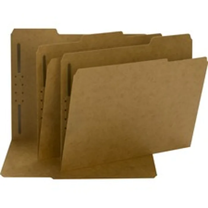 Keep papers secure and in order, even when folders are handled by lots of people and transported out of the office. Folders feature one fastener in position No. 1 that holds papers securely and keep them in order. Heavy-duty kraft stock withstands wear and tear from taking papers out of the office or handling by many people. Two-ply tab gives added strength at the point of greatest wear. Reinforced tabs are 1/2" high and 1/3 cut in assorted positions. Letter-size fastener folders are scored for 3/4" expansion and made of 11 point Kraft stock. Other features include front panel undercut, a 2" prong K-style fastener, and rounded top corners (front and back).