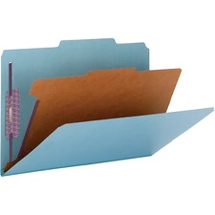 Heavy-duty classification folders feature patent-pending, SafeShield Coated Fastener Technology to help prevent paper tears, finger cuts and excessive fastener crinkling. SafeShield adds protection for papers and fingers while also reducing fastener crinkling. Fasteners on front and back panels and the divider create separate filing surfaces within one folder. These two 2" coated fasteners on the panels are in positions 1 and 3. Legal-size folder also offers a 2" expansion and is made of sturdy, 25 point Pressboard stock. The divider offers a 1" SafeShield-coated, twin-prong fastener and is made of 17 point stock.