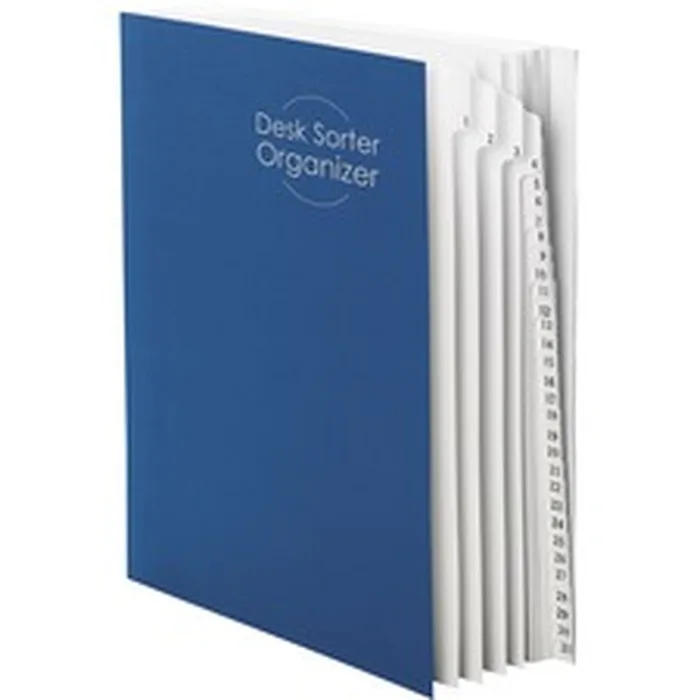 Desk filer/sorter keeps loose paperwork neatly categorized. Heavyweight dividers are bound book-style so it's easy to open to the desired section. Holes in dividers help to locate papers remaining in file. Each divider is made of gray stock and has poly-reinforced tabs labeled 1 to 31. Dividers are printed in black ink on front and back sides of tab. Organize papers by the date follow-up action needs to be taken. Each section expands to 1-3/8" and holds letter-size documents. File/sorter also features an accordion fold that is tape-reinforced for durability.