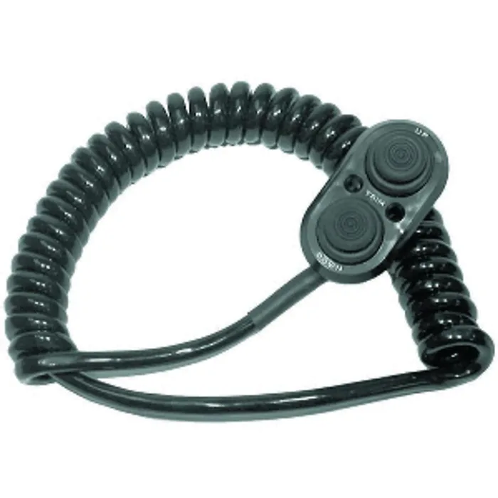 This steering trim control unit is molded of black plastic with raised white letters to not only enhance boat appearance but also provide the ultimate in control of any high performance boat. The steering trim control unit mounts easily to steering wheel spokes to place engine trim control at your finger tips for maximum safety and ease of operation. The weather proof, rubber booted, push button switches combined with a black urethane coiled cord provide a unit which will provide trim control without removing hands from steering wheel.