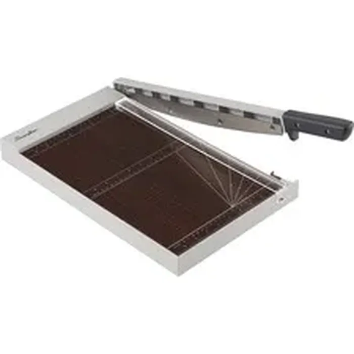 General InformationManufacturer:ACCO Brands Corporation Manufacturer Part Number:G7010012 Manufacturer Website Address:http://www.acco.com Brand Name:Swingline Product Line:Classiccut Product Name:ClassicCut Guillotine Wood Trimmer Marketing Information:Create clean, professional cuts for your papers, photos and artwork with this ClassicCut Guillotine Trimmer. It has a solid wood surface and EdgeGlow LED lighting to help you achieve a clean, accurate cut every time. EdgeGlow LED light guide illuminates the edge of the trimmer to show exactly where cuts will be made. Solid wood surface is printed with alignment guides to help improve trimming accuracy. Guillotine blade has 15" cutting length and cuts up to 10 sheets at once. Safety latch keeps blade in place when not in use. Trimmer includes three AAA batteries. Packaged Quantity:1 Each Product Type:Guillotine Trimmer