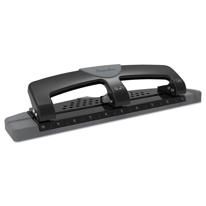 Perfect for any office worker's desktop, this easy-to-use three-hole punch reduces the amount of effort it takes to punch a set of holes. The low-force punch design of the SmartTouch makes it 50 percent easier to punch three crisp, clean holes through as many as 20 sheets than with a standard paper punch. Hole pattern in punch base allows you to see when chip tray is full. Punch has a removable base and a back opening for quick paper-chip disposal. The resulting 9/32" holes from the fixed punch heads are perfectly spaced to easily insert sheets into a three-ring binder or presentation folder. Soft grip handle further increases comfort of manual hole punching. Handle locks into a closed position for compact storage. Durable, metal hole punch also features a built-in ruler and edge guide for better punch alignment.