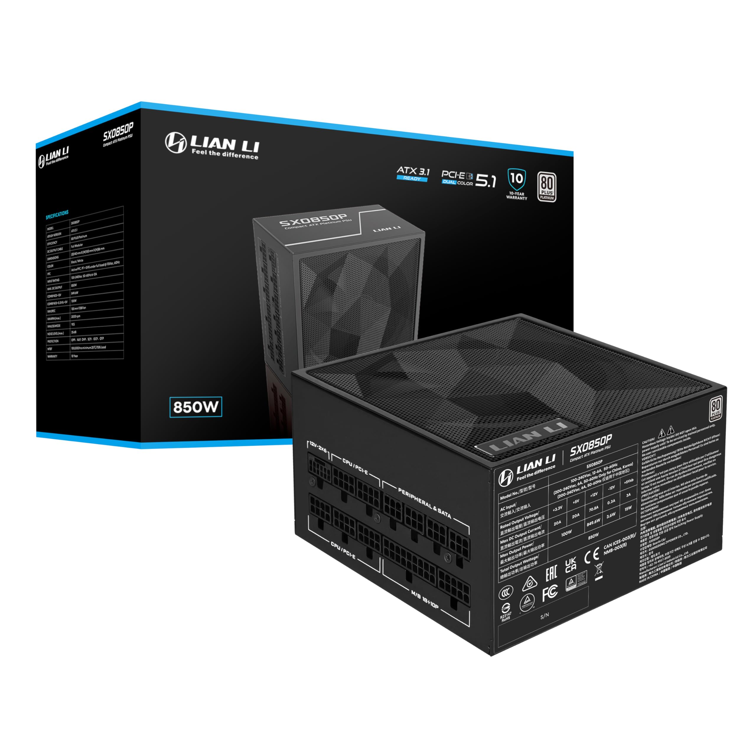 The Lian Li SX 1000W is a high-performance power supply designed for compact systems. Fully modular and compliant with ATX 3.1 and PCIe 5.1 standards, it ensures compatibility with the latest hardware. This power supply boasts a Cybenetics Platinum efficiency rating, making it an ideal choice for both performance and energy savings.