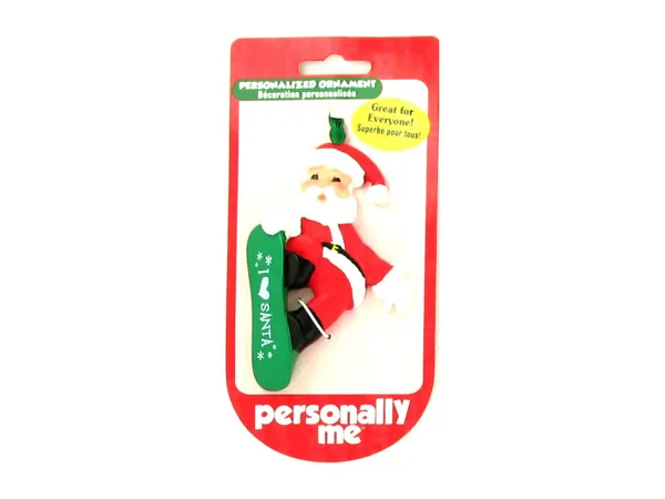 Celebrate the spirit of 2007 with this delightful Santa ornament. This charming decoration features Santa mid-action on his snowboard, proudly displaying the year "2007" on the bottom. The bright green ribbon adds a festive touch for easy hanging on your tree.