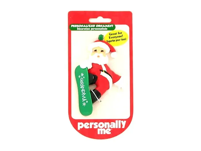 Give grandma a special ornament of her own with this adorable Santa ornament. This festive Santa figure is joyfully holding a snowboard and catching some air. The snowboard proudly displays the word "Grandma" and is elegantly hung from a vibrant green ribbon.