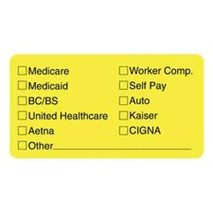 Labels to indicate insurance coverage provider are created for medical office use to convey vital information quickly and easily. The list with check-off boxes by each entry includes Medicare, Medicaid, Aetna, United Healthcare, BC/BS, workers comp, self-pay, auto, Kaiser or CIGNA. The label also has an entry marked, "Other" with a line to write in another insurance provider.