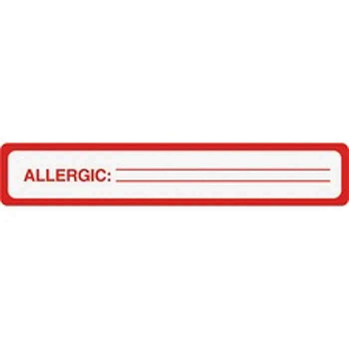 These labels with the message "Allergic:" alert staff of patient allergies to avoid medication mishaps. Fluorescent, easy-to-read labels stand out on patient files and charts.