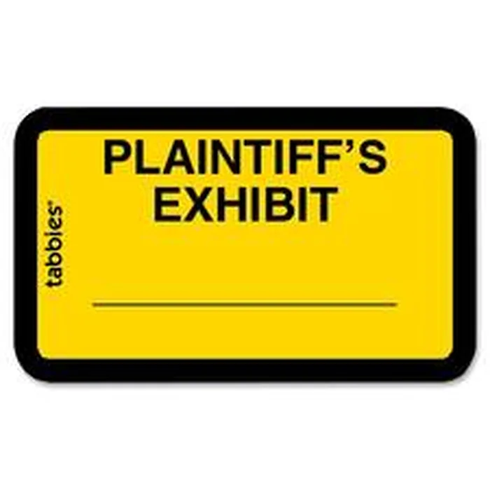 In offices, courtrooms or judges' chambers, these handy 1-5/8" x 1" labels will save time referencing exhibits for the plaintiff. Apply color-coded labels directly to legal documents, case reports, letters, photos and depositions for fast and easy identification. Each label features the words, PLAINTIFF'S EXHIBIT, in bold black letters and a space for writing exhibit letters or numbers.