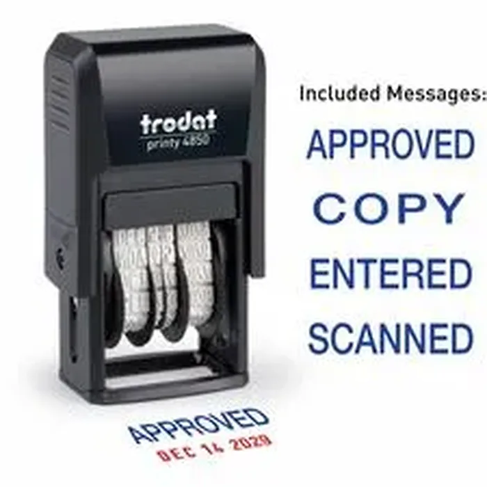 General InformationManufacturer:Trodat GmbH Manufacturer Part Number:E4853L Manufacturer Website Address:http://www.trodatmarking.com Brand Name:Trodat Product Name:Micro Message Date Stamp Marketing Information:This Micro Message Date Stamp maximizes your stamping options in a compact format. It can be used with date only, or with one of four interchangeable key phrases to surround the date with approved, copy, entered or scanned. Efficient design provides 10 years of dates and 10,000 impressions before the stamp pad needs to be replaced. Stamp creates a 3/4" x 1" impression. Packaged Quantity:1 Each Product Type:Self-inking Stamp
