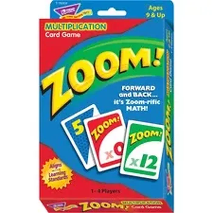Multiplication and addition skills soar with this exciting card game. Players watch for wild cards that send scores zooming forward, backward or stall a turn. Design aligns with learning standards. Zoom! Learning Game includes 100 playing cards for one to four players. Use the game to teach students ages 9 and up.