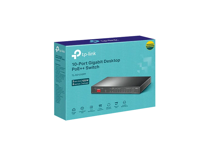 The 10-Port Gigabit Desktop Switch is designed for robust performance with a combination of PoE+ and PoE++ capabilities. Featuring 6 PoE+ ports and 2 PoE++ ports, this switch can accommodate a wide range of network devices with power delivery.