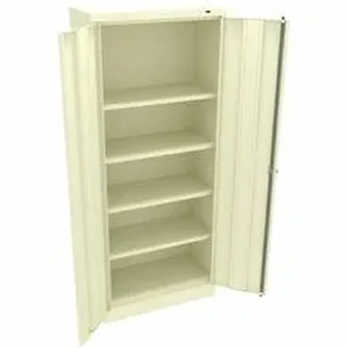 Standard-size, slim storage cabinet features premium-quality steel throughout for maximum rigidity. Dual swing-out, reinforced doors ride on heavy-duty leaf-hinges. Three-point locking system ensures secure storage for bulky materials. Simply turn the polished chrome handle and doors lock at three points for maximum security. Nylon guides help make operation quiet. Cabinet base offers a "box" construction technique to prevent racking. Punched lances in back facilitate ventilation. Raised base keeps contents out of harm's way from cleaning liquids. Storage cabinet also includes four adjustable steel shelves that you can move in 2" increments without tools. Each shelf holds up to 150 lb.