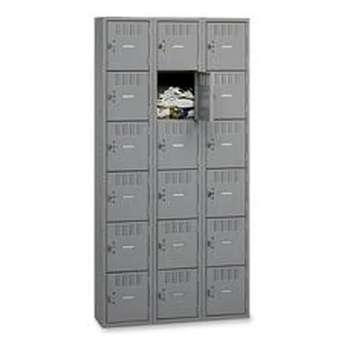 Six-tier box locker is made of heavy-gauge steel and offers tamperproof hinges. Each compartment measures 12" wide x 18" deep x 12" high. Vertical louvers provide ventilation. Locker includes number plates for locker identification. Each door has a padlock hasp. Locker does not include padlock. Multiple rows of lockers can be ganged with standard nuts and bolts, which are not included.