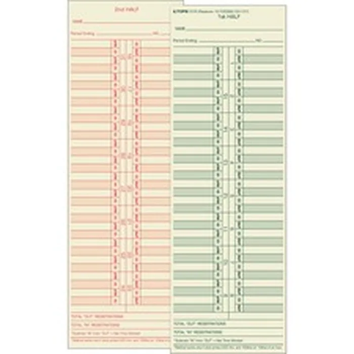 Two-sided time cards feature semi-monthly format and numbered days with first half of month on front in green ink and second half of month on back in red ink. Screened in and out boxes provide a quick way to check of hours worked. Total "out" and "in" registration lines to give net time worked. Extra-heavy material is made of 143 lb. manila stock. Time card replaces 100372, 10-100382, CH131, L34B, 1950-9360 and is designed for use with Acroprint 125R, 150R, ES700, ES900, ESP180, 175TR; Cincinnati 1000, 10000; Lathem 900E, 1200, 1500E, 2000, 4000, 5000EP; Simplex KCF, KCG, JCG, JCP and 2500.