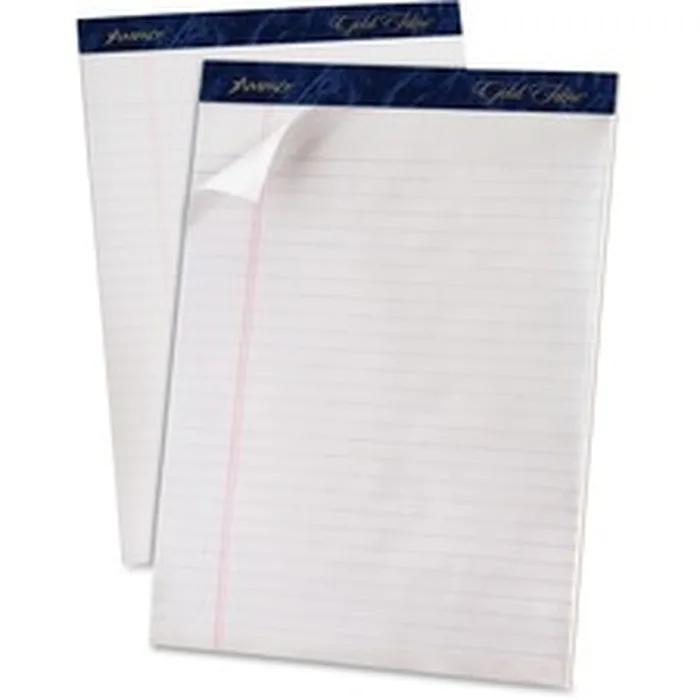 Perforated pad is ideal for office and home use. Watermarked paper will not bleed through. Dark blue binding at top is stapled and glued. Extra-thick, chipboard back offers stiff support when writing. Sheets are microperforated for clean separation. Pad contains 50 legal/wide-ruled sheets of 20 lb. white paper. Each letter-size sheet has 11/32" line spacings and a 1-1/4" left margin.