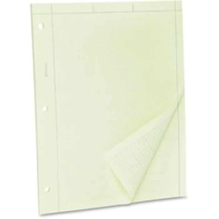 Engineers' quadrille pad features 15 lb. green tint paper that is printed on both sides. Front side is unruled with single margin lines at top and sides. Back side is printed with a cross-section grid of 5 squares per inch. Pad is three-hole punched to fit inside standard-size binders.